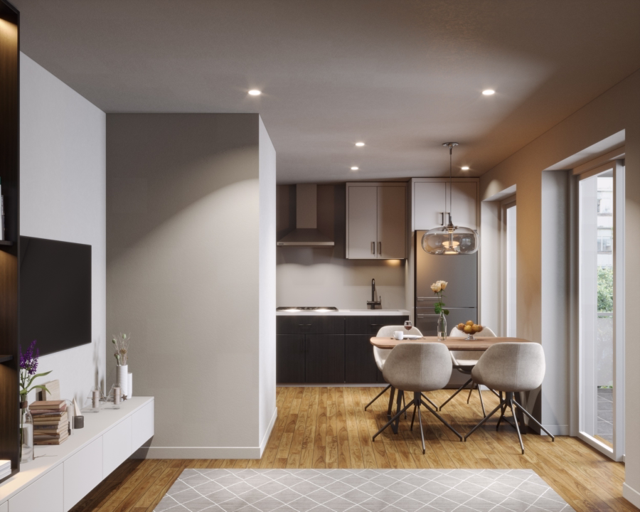 Die hier verwendeten Darstellungen und Visualisierungen sind mögliche Einrichtungskonzepte auf Basis der Vorplanung, die von der endgültigen Umsetzung abweichen können. Alle dargestellten Einrichtungsgegenstände und Innenausbauvarianten sind nicht im Kaufpreis enthalten. Die Wohnungen werden leer gemäß Baubeschreibung gekauft.