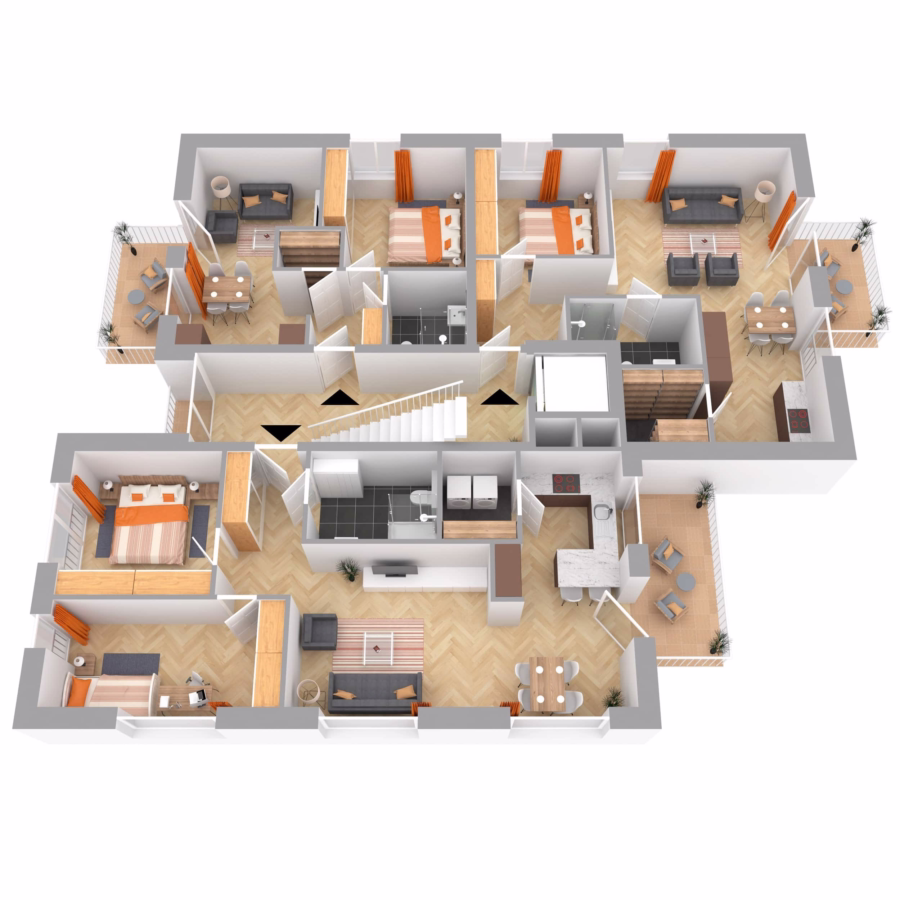Die hier verwendeten Darstellungen und Visualisierungen sind mögliche Einrichtungskonzepte auf Basis der Vorplanung, die von der endgültigen Umsetzung abweichen können. Alle dargestellten Einrichtungsgegenstände und Innenausbauvarianten sind nicht im Kaufpreis enthalten. Die Wohnungen werden leer gemäß Baubeschreibung gekauft.