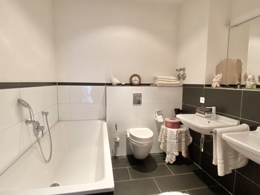 - Hauptbad mit Doppelwaschtisch und Wanne