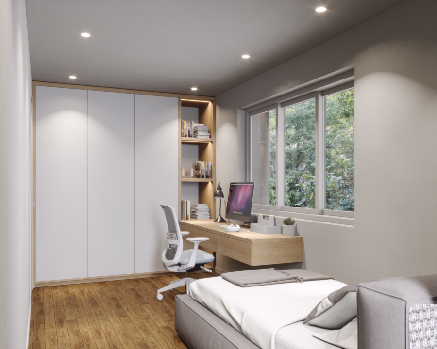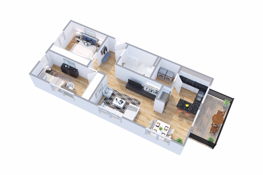 Die hier verwendeten Darstellungen und Visualisierungen sind mögliche Einrichtungskonzepte auf Basis der Vorplanung, die von der endgültigen Umsetzung abweichen können. Alle dargestellten Einrichtungsgegenstände und Innenausbauvarianten sind nicht im Kaufpreis enthalten. Die Wohnungen werden leer gemäß Baubeschreibung gekauft.